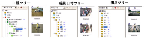 ツリーの種類 また、ツリーとXML情報の関係は「工種」「種別」「細別」だけでなく、撮影日時や測点などに切り替えることが出来ます。